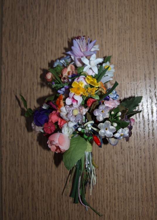 The bouquet contains small vintage and old flowers, stamens and leaves.