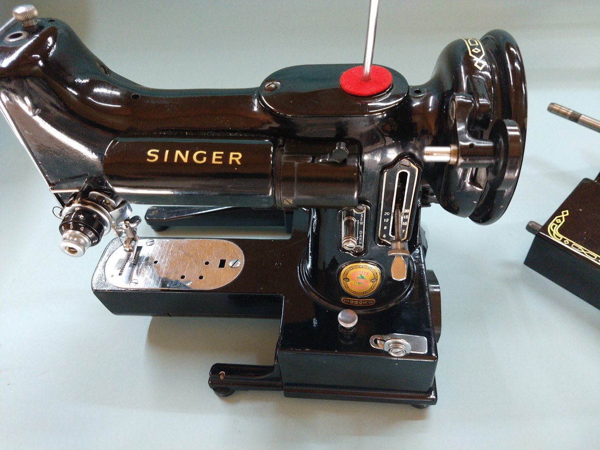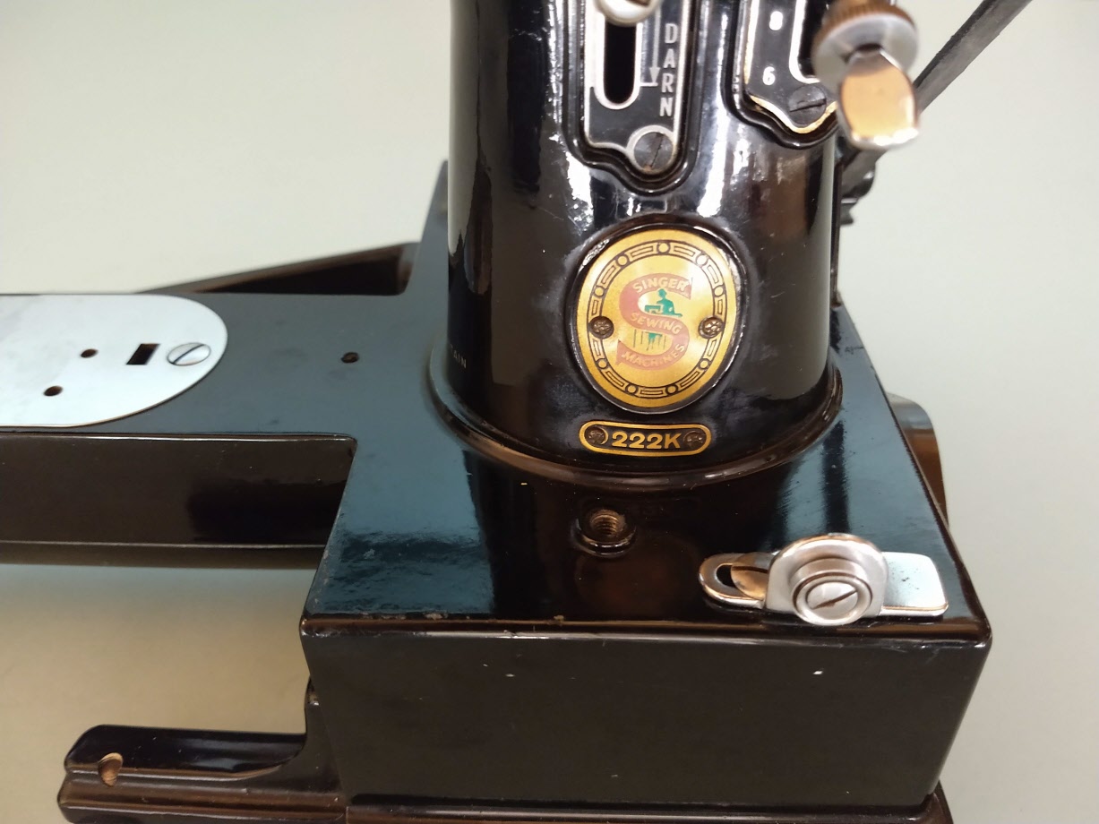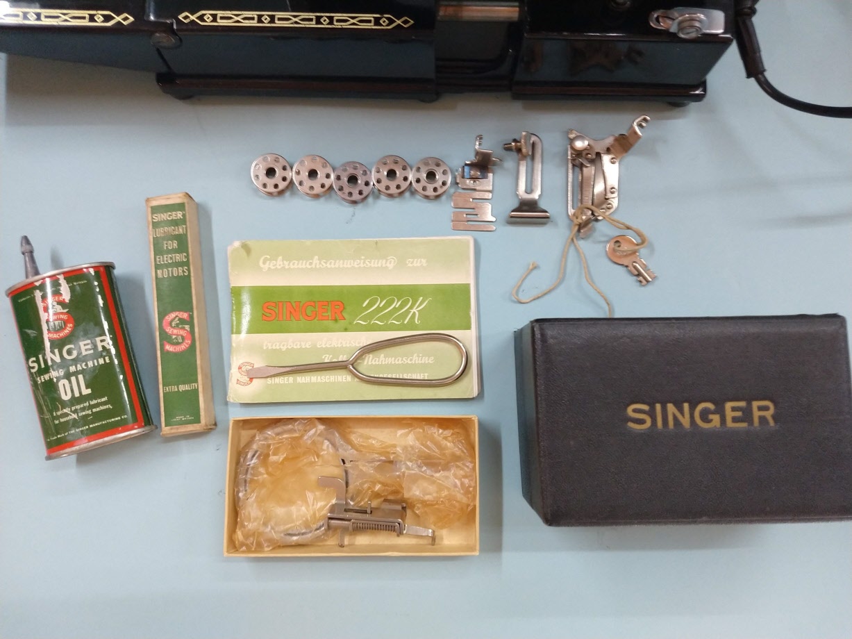Stunning, hard-to-find Singer Featherweight 222K free-arm machine in excellent condition from about 1957, completely serviced. She sews beautifully as you can see from the stitching sample sewn on a piece of finest Swiss mousseline without the aid of a "walking foot" or anything else, just letting the fabric feed through freely. In addition, there is a box of extra feet with German instructions (easily followed because of the illustrations) and, as an added bonus, the embroidery hoop with embroidery foot (usually the foot is missing), original Singer machine oil and Singer lubricant. The decals are in very good condition and are original.