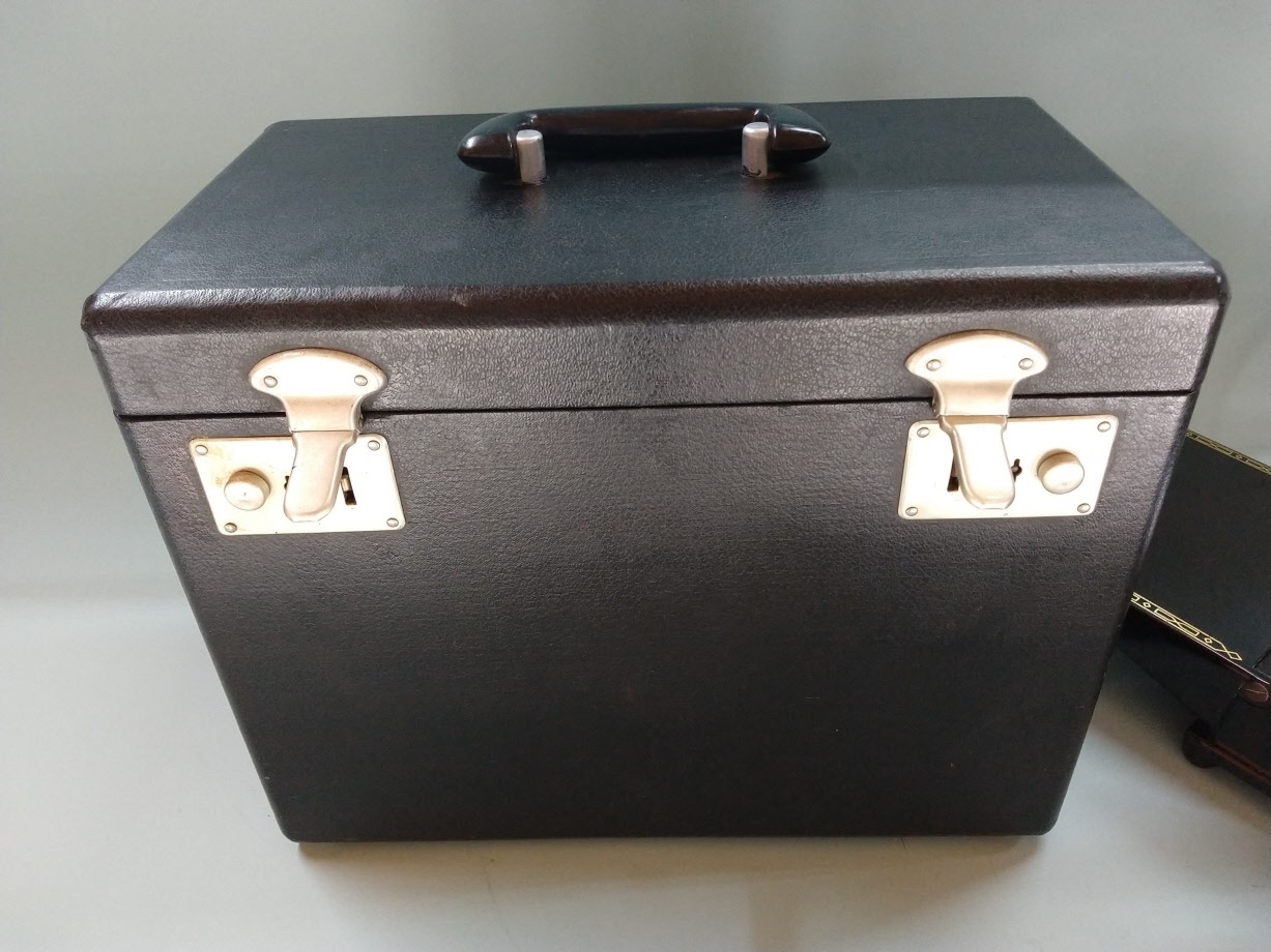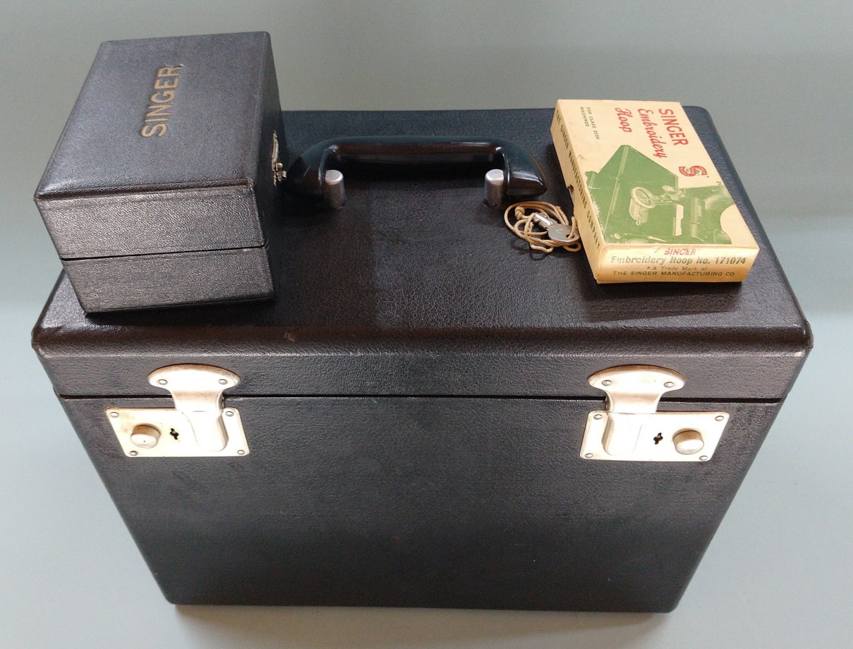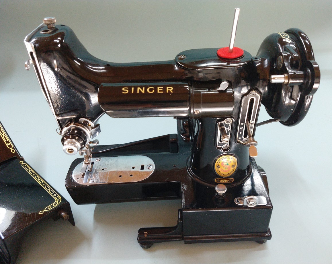 Stunning, hard-to-find Singer Featherweight 222K free-arm machine in excellent condition from about 1957, completely serviced. She sews beautifully as you can see from the stitching sample sewn on a piece of finest Swiss mousseline without the aid of a "walking foot" or anything else, just letting the fabric feed through freely. In addition, there is a box of extra feet with German instructions (easily followed because of the illustrations) and, as an added bonus, the embroidery hoop with embroidery foot (usually the foot is missing), original Singer machine oil and Singer lubricant. The decals are in very good condition and are original.
